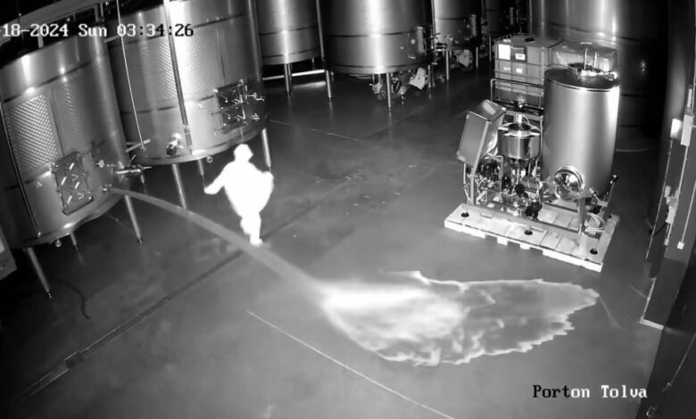 De acuerdo con un video capturado por las cámaras de seguridad de la bodega, una persona, todavía sin identificar, entró a los depósitos de vino para abrir las tuberías de tres estos y derramar todo el líquido posible.