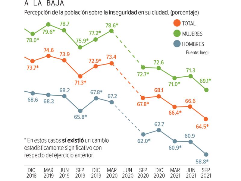 El estudio trimestral realizado por el Instituto Nacional de Estadística y Geografía (Inegi) establece que la cifra de sensación de inseguridad, en septiembre de 2121, también es menor en comparación con 66.6% de la población que dijo sentirse insegura en su ciudad en junio de este año.