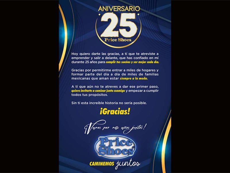 A propósito de su 25 aniversario, Price Shoes, la empresa de moda en zapatos, ropa y joyas, agradece a cada uno de sus afiliados por confiar en ella para emprender, autoemplearse, cumplir sus sueños y ser cada día mejor.